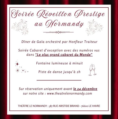 Afficher le planPour célébrer la fin de l’année 2025, le Normandy se pare de ses plus beaux atours et vous invite à vivre une soirée inoubliable. À l’occasion de la St Sylvestre, le théâtre se transforme en véritable cabaret, où la fête, l’élégance et la convivialité s’entrelacent jusqu’aux douze coups de minuit.